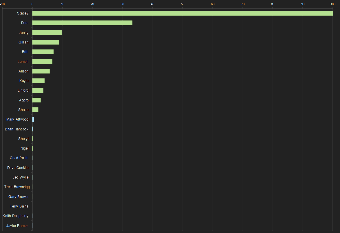 Paul O’Grady, the British comedian turned TV presenter and author, changes the picture quite significantly. He has only 13,340 followers, but he isn’t following anyone, so his value is infinite. But for the purposes of calculating a number, we must assume that he is somewhat interested in at least someone, so we added an arbitrary variable to our formula which gives him a value of 441 KiloFrys or 0.44 MegaFrys.